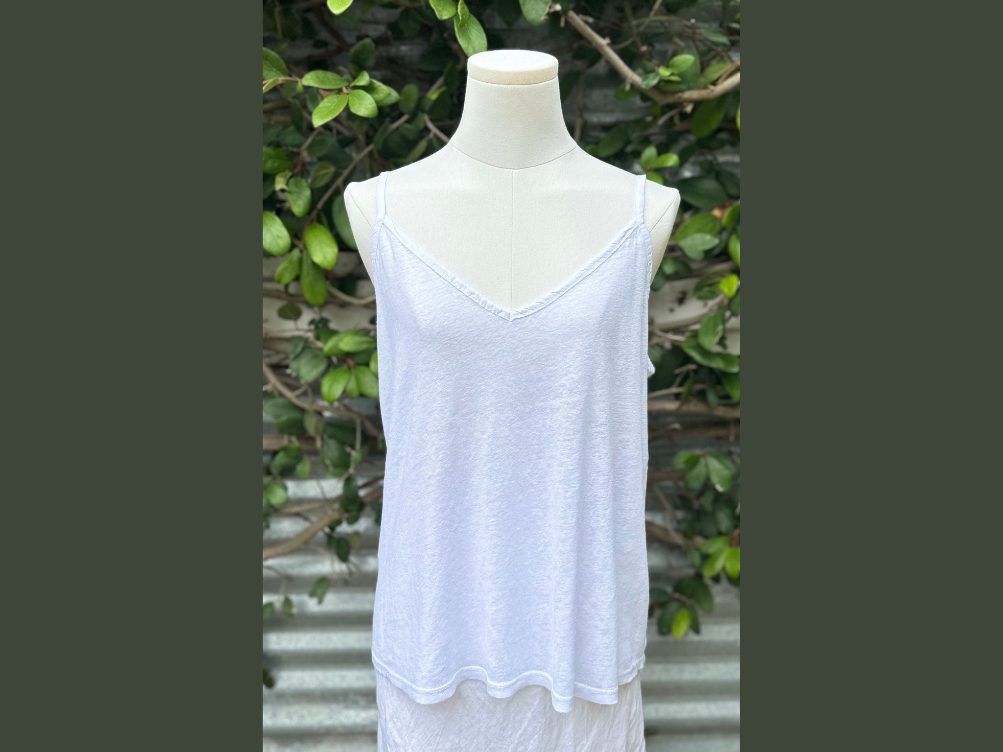 This camisole features straps and is crafted from a blend of linen and cotton.