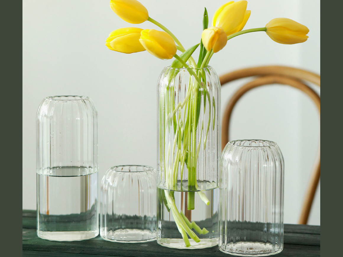*Three sizes are available in 4''T/6''T/8''T X 3.5''W; *Made in light weight Borosilicate Glass; *Used as floral vases, and any tabletop decorative vases; *Special design with small opening and stripes;These beautiful hand made ligth weight Borosilicate glass vases bring as much joy as the flowers they will hold. With a gentle, round shape and stripes, they add the perfect touch to any space with minimal effort.