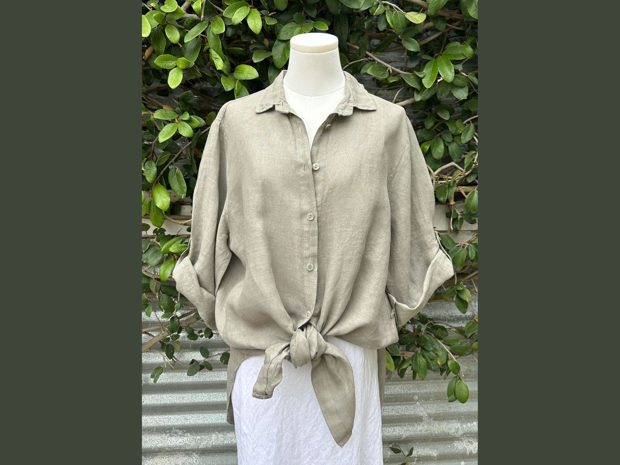 This elegant long linen blouse features a refined button-down front and graceful long sleeves. Crafted from breathable linen, it offers a sophisticated silhouette that drapes effortlessly. Designed in a versatile one-size fit, it combines timeless style with comfort, making it an ideal choice for both casual and polished ensembles.