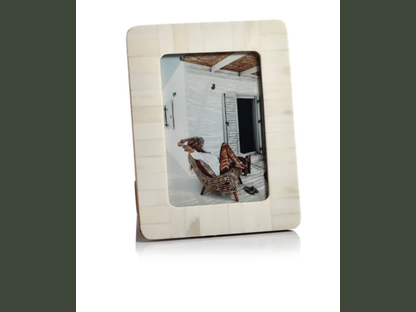 Display your treasured moments in this white bone inlay photo frame, distinguished by its gently rounded corners. The refined ivory finish brings a graceful and understated elegance to any space, ideal for presenting your beloved photographs with a tasteful and effortless charm.